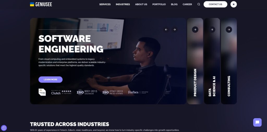 Geniusee started in 2017 as a software development and cloud partner. They now employ 300+ specialists and have delivered 180+ projects. The company positions itself as flexible: they work with startups and enterprise clients alike. Their focus includes AWS-based infrastructure, AI integration, and custom development. Certifications include AWS Advanced Tier, ISO, and ISTQB. Industries they know well: FinTech and EdTech among others.